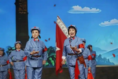 作为河南文化名片,豫剧在展演中大放异彩:河南广电老年大学豫剧流派特色班学员徐淑娣、马丽彩唱“连娟妹送我太湖岸”选段,韵味醇厚;河南省老干部豫剧团闫敬彩等则以红色经典《红色娘子军》选段“同心踏碎旧世界”展现初心力量。
