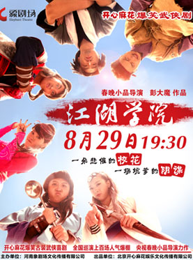 《江湖学院》精彩看点: 喜剧“闹”却不俗 《江湖学院》是一部“闹”却不俗的剧,“闹”剧虽然贴近平民化、大众化,但并非低俗化。看完《江湖学院》,会让很多观众在开怀大笑之余对社会的现实有些思考和共鸣。把包含常规叙事,却又带着荒诞、虚构、武侠、搞笑元素的故事,通过局限的舞台讲述给大家,这是很大的挑战。 春晚小品导演作品 《江湖学院》是开心麻花签约导演彭大魔的作品。彭大魔是2013央视春晚小品《大城小事》的导演之一,曾执导开心麻花《疯狂的石头》、《阿翔》、《江湖学院》、《旋转卡门》、《夏洛特烦恼》等多部优秀作品。《江湖学院》是彭大魔目前自己最喜欢的一部作品,也是他自己评价“结构完整、遗憾较少”的一部作品。 《江湖学院》这部戏的灵感,首先是来自一种“校园情结”。每个人都有过校园的时光、青涩的爱情、有过青春的梦想,也见证过梦想和现实的差距,《江湖学院》讲述的是“明”朝时虚构的武侠故事,但是融合了能够触动观众的情愫。 百场历练 新鲜包袱全面升级 《江湖学院》已在全国巡回演出百余场,所到地都赢得观众的热烈反响。该剧将每年的实事亮点,如“抢盐”事件等,全部编成爆笑包袱编入剧中。经过百余场巡演的历练,如今的《江湖学院》携新鲜包袱、笑料,重新亮相。新“笑果”,令人捧腹,爆笑值得期待。 不灭的校园情结 永远的青春回忆 开心麻花爆笑武侠剧《江湖学院》,讲述的是发生在江湖学院里由一块“入校牌”引发的江湖纷争,也在爆笑的故事背后展现了每个人心中不灭的校园情结,永远的青春回忆。对偶像的崇拜,争在老师面前“良好”表现,为迷恋的校花强出头,暗恋,失恋……所有那些曾经让人心动的青春回忆,牵动着每个人心底的那一片美好纯真。 开心麻花爆笑古装武侠喜剧《江湖学院》 《江湖学院》角色亮点 黄瓜——史上最缺的大侠 从未想过混迹江湖,最大的梦想是成为大厨;迷恋校花庄纯,一心想博得美人青睐;阴差阳错习得《功夫菜谱》,练就神功“网仙诀”,成为一代大侠。 评语:很会爆炒的神厨大侠。 公子艾——史上最装的大侠 自称拥有显赫家世,拥有风流倜傥的外表;在危难面前从不上前,在功劳面前从不后退;在师傅面前爱显摆。 评语:我的功劳是我的,大家的功劳也是我的。 庄纯——史上最拜金的女侠 整过容,杀过狼;拥有迷人的外表,伪装的淑女气质;为达目的不择手段,却最终被爱情感动。 评语:真真假假,假假真真,一切取决真相的重要性。 贵小雪——史上最窦娥的女侠 峨眉派女弟子,作为关系户,深得师母喜爱;看不惯庄纯,暗恋黄瓜,最大的特点是心里怎么想就怎么说;为爱牺牲。 评语:世间最有情义的女子,也是世间最心直口快的女子。 师父于满仓——史上最“坑爹”大侠 放弃祖上的捕渔业,开办“江湖学院”,培养出一代大侠黄重;最怕老婆谢三娘,目标就是抢过老婆的风头。 评语:曾经有一个放弃这段“孽缘”的机会,他没有珍惜,后来追悔莫及。 师母谢三娘——史上最爷们儿的女侠 对老公和学生都十分严厉;最会服用红药;爱金钱,恨朝廷;最爱老公,生死不离不弃。 评语:表面“母老虎”,夫唱妇随,爱很含蓄。 大师兄——史上最伤不起的大侠 身材纤瘦,弱不禁风,一直没有找到正经工作;墙头草,做师傅展现威风的棋子,被师弟、师妹误解为奸细;戳到痛处时,落下”英雄泪“。 评价:身体瘦弱,赋闲在家,失业的师兄伤不起呀。 汪直——史上最羡慕嫉妒恨的太监总管 拥有屠夫般的面容,黄鹂鸟般的声音;当过搬运工,做过黑衣人;拥有最显赫的家室,不爱美人,爱江山。 评价:不要以貌取人,其实他爸是李刚。